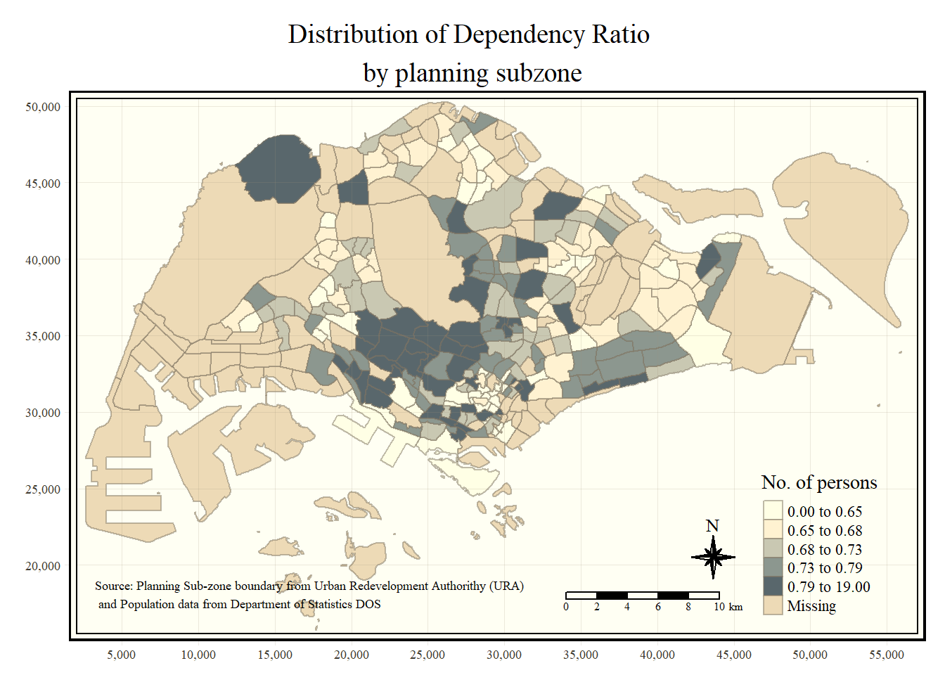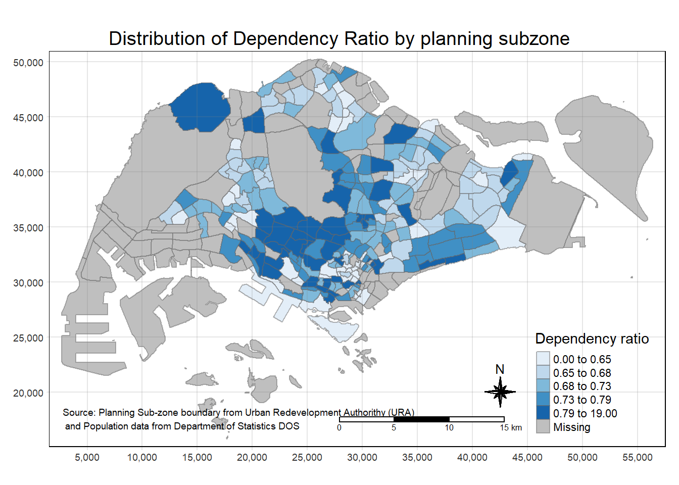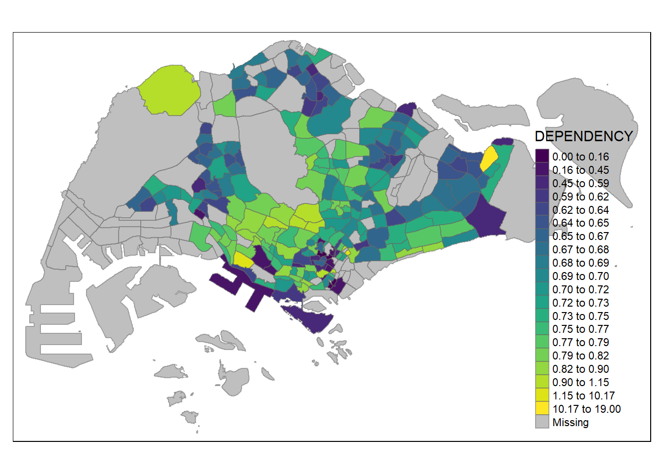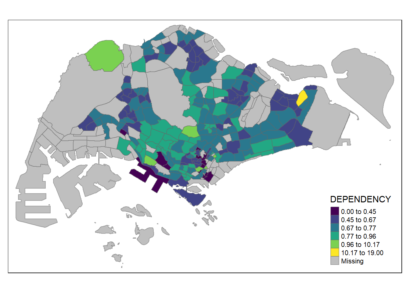 The resulting map shows the dependency ratio specifically for this region, with additional customization for the legend and layout.