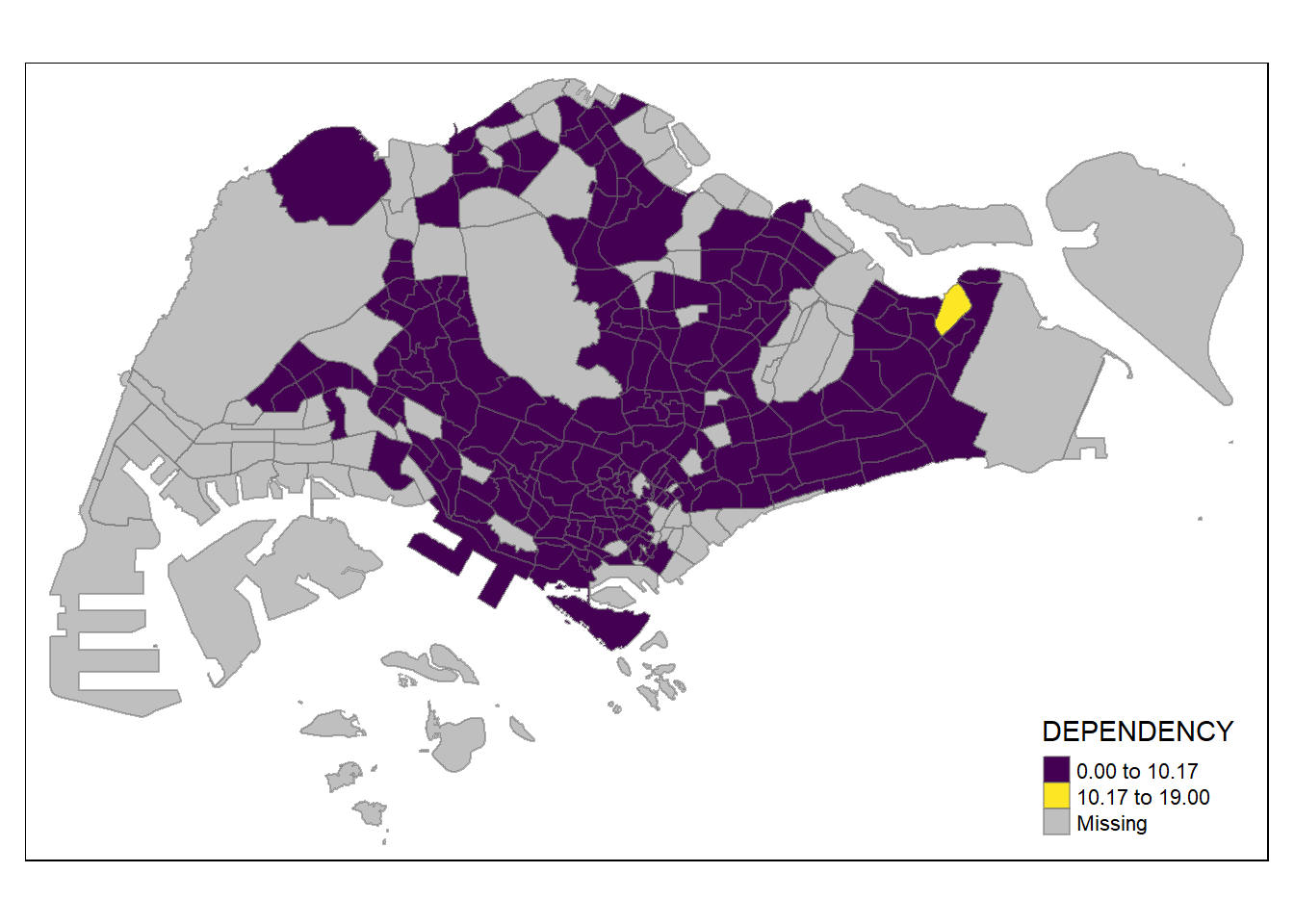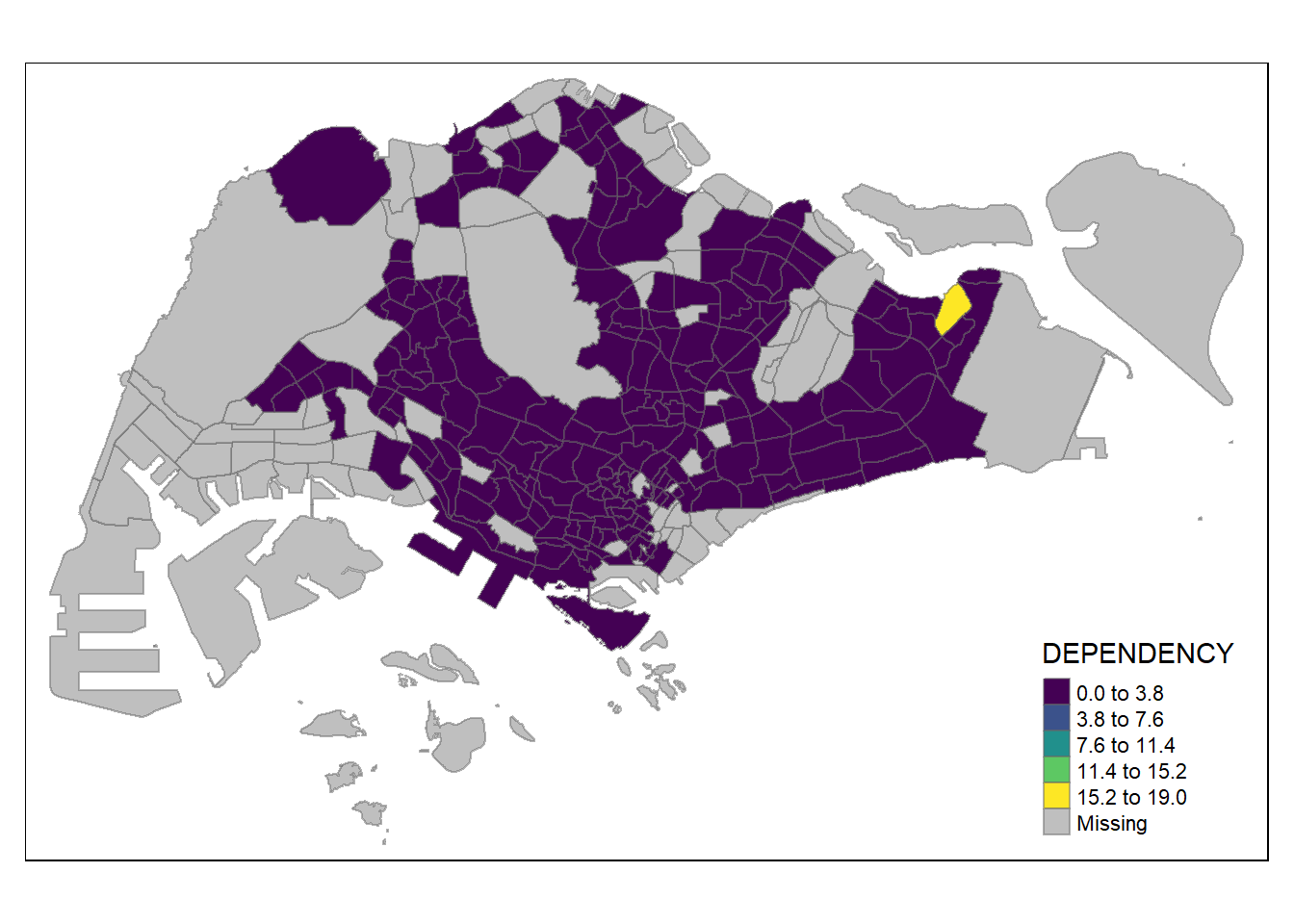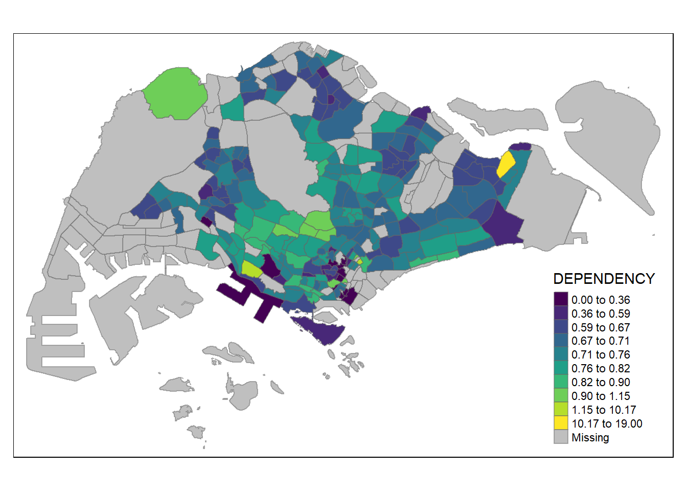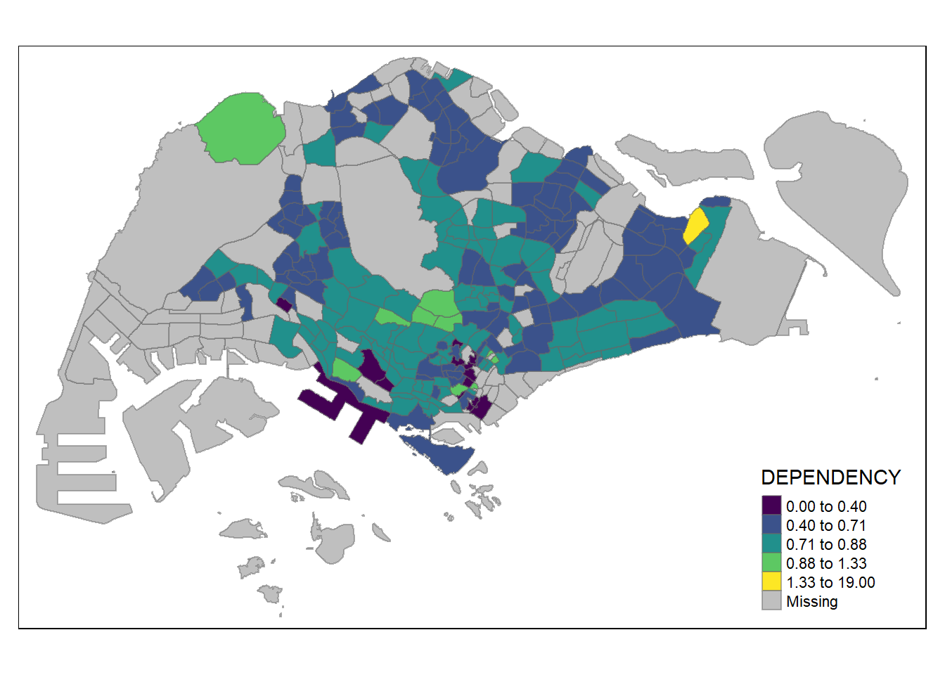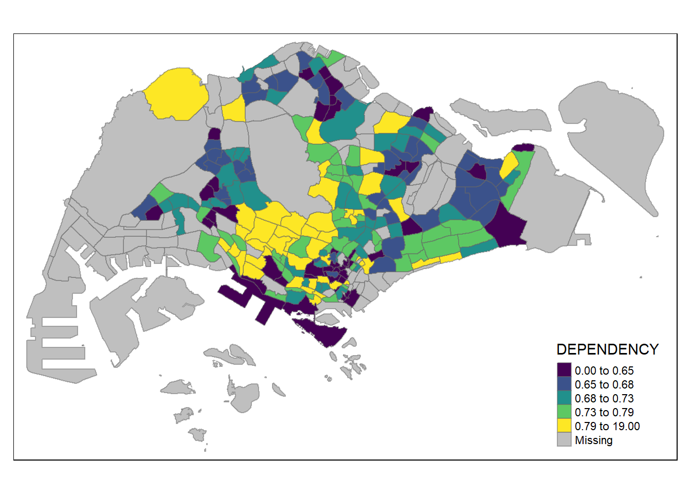 The resulting map shows the dependency ratio specifically for this region, with additional customization for the legend and layout.