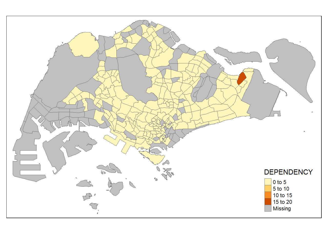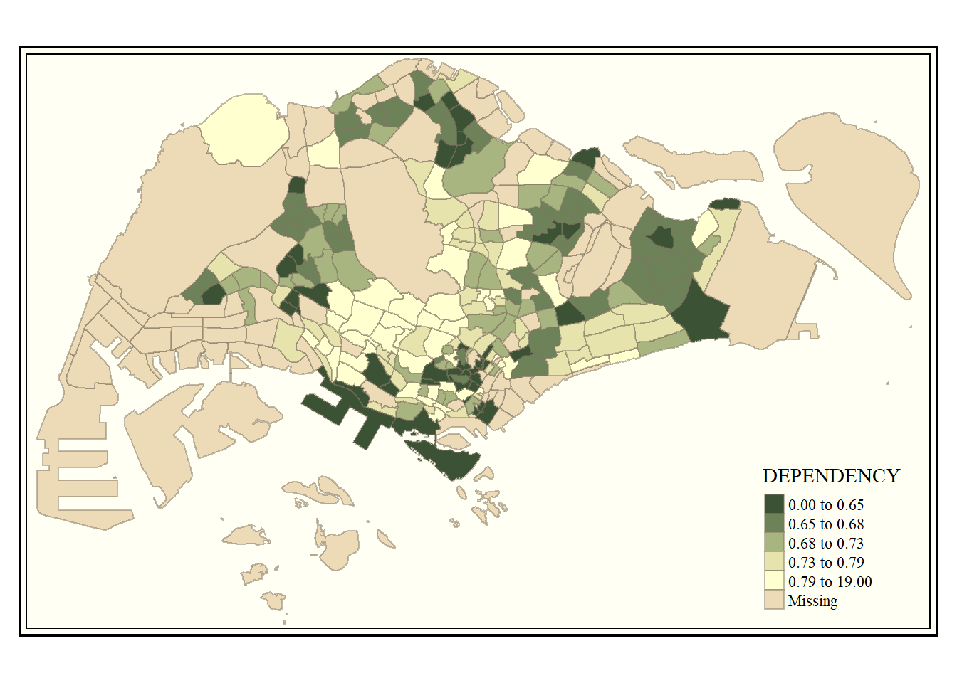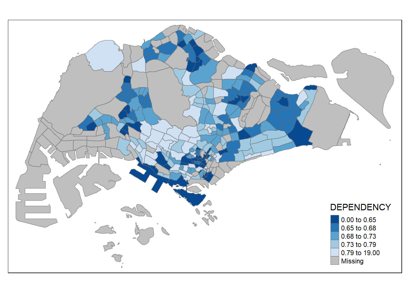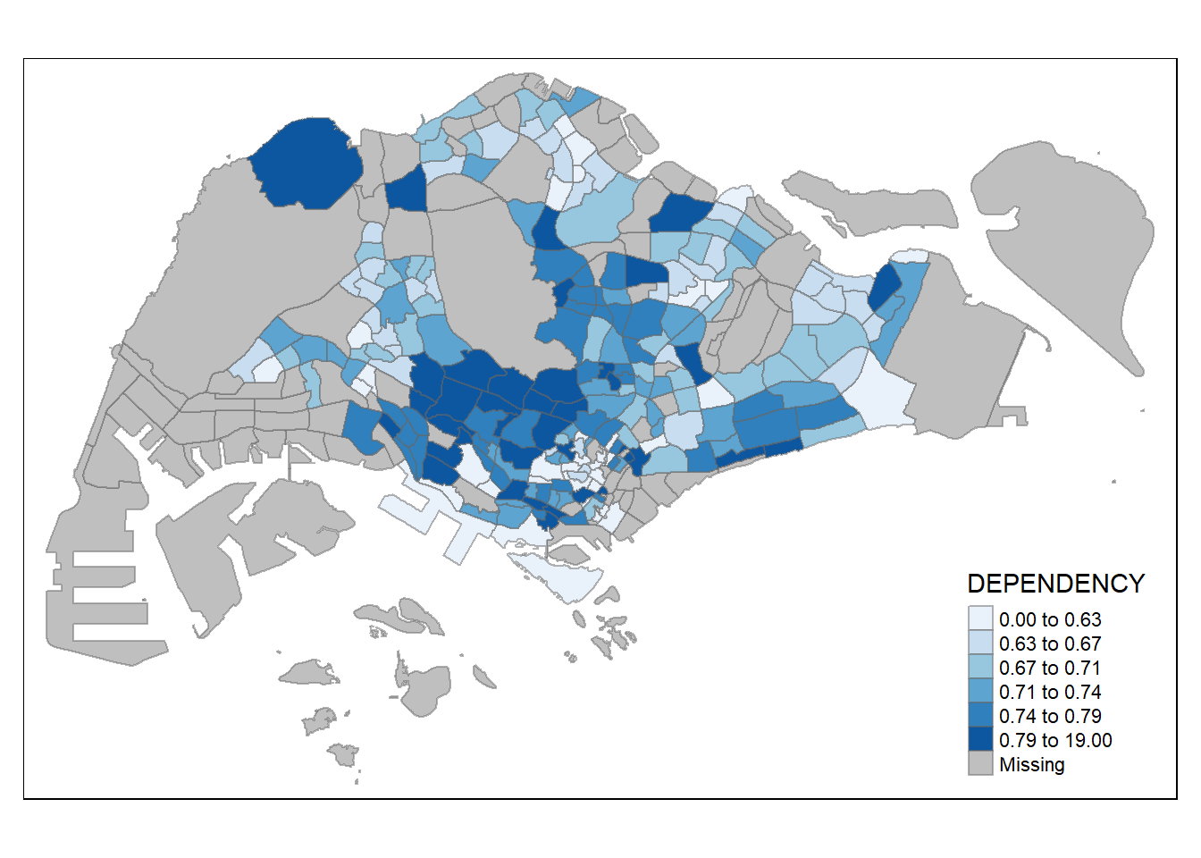 The resulting map shows the dependency ratio specifically for this region, with additional customization for the legend and layout.