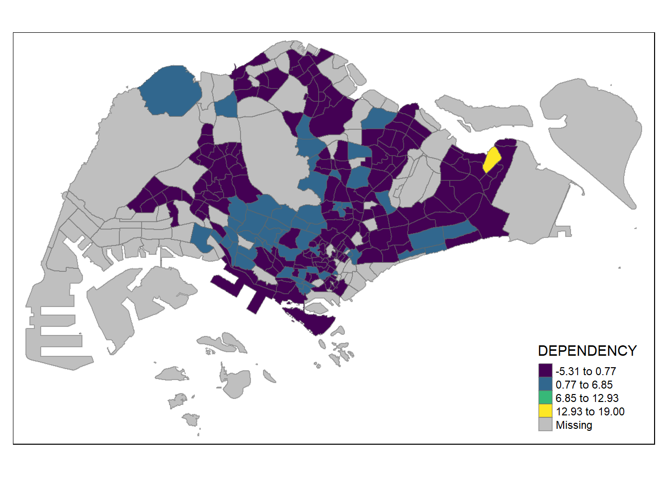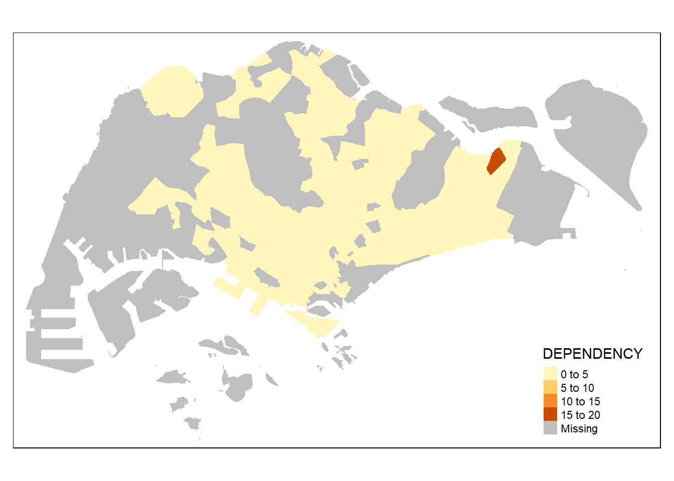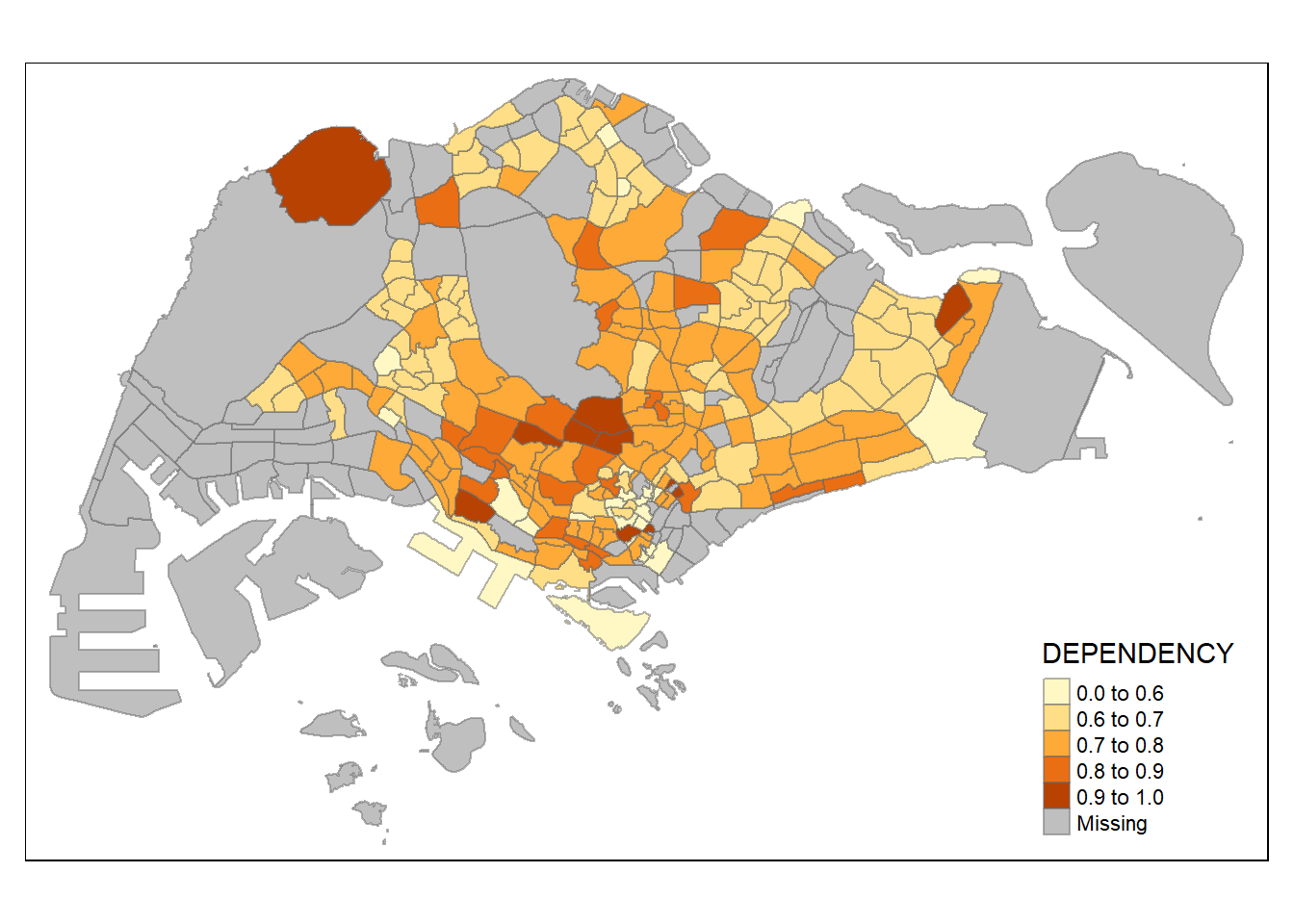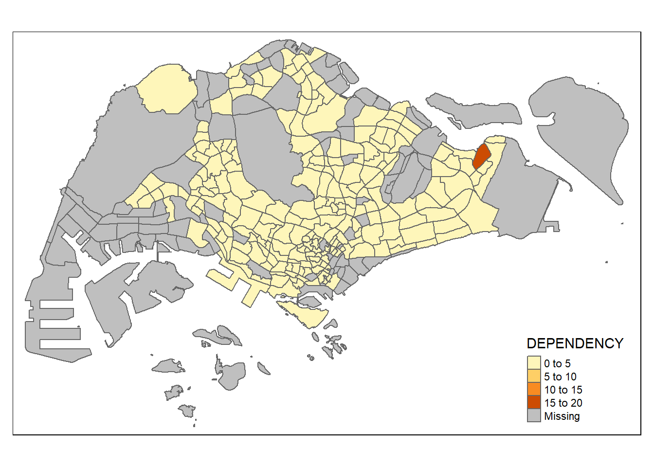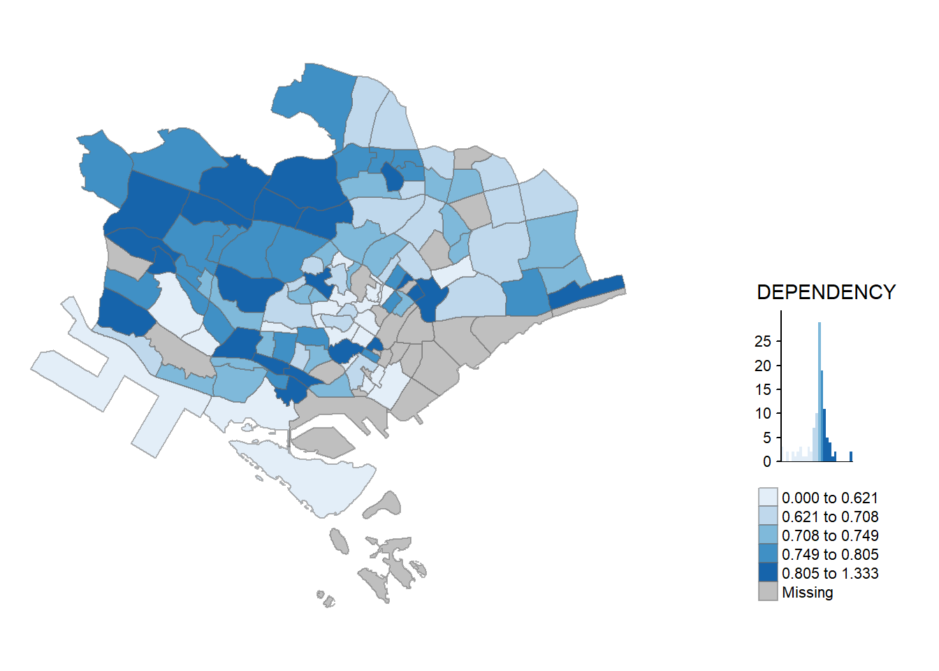 The resulting map shows the dependency ratio specifically for this region, with additional customization for the legend and layout.