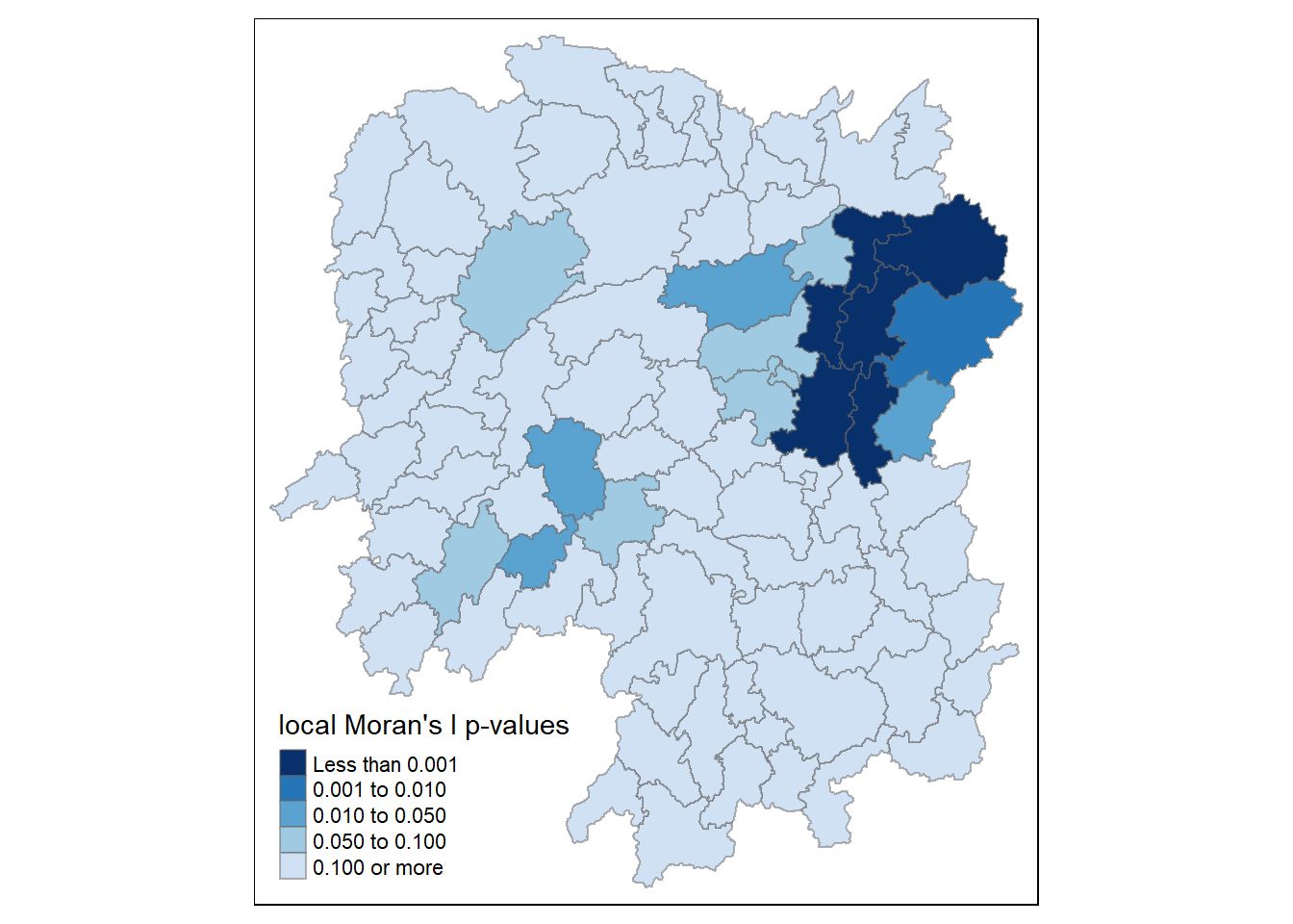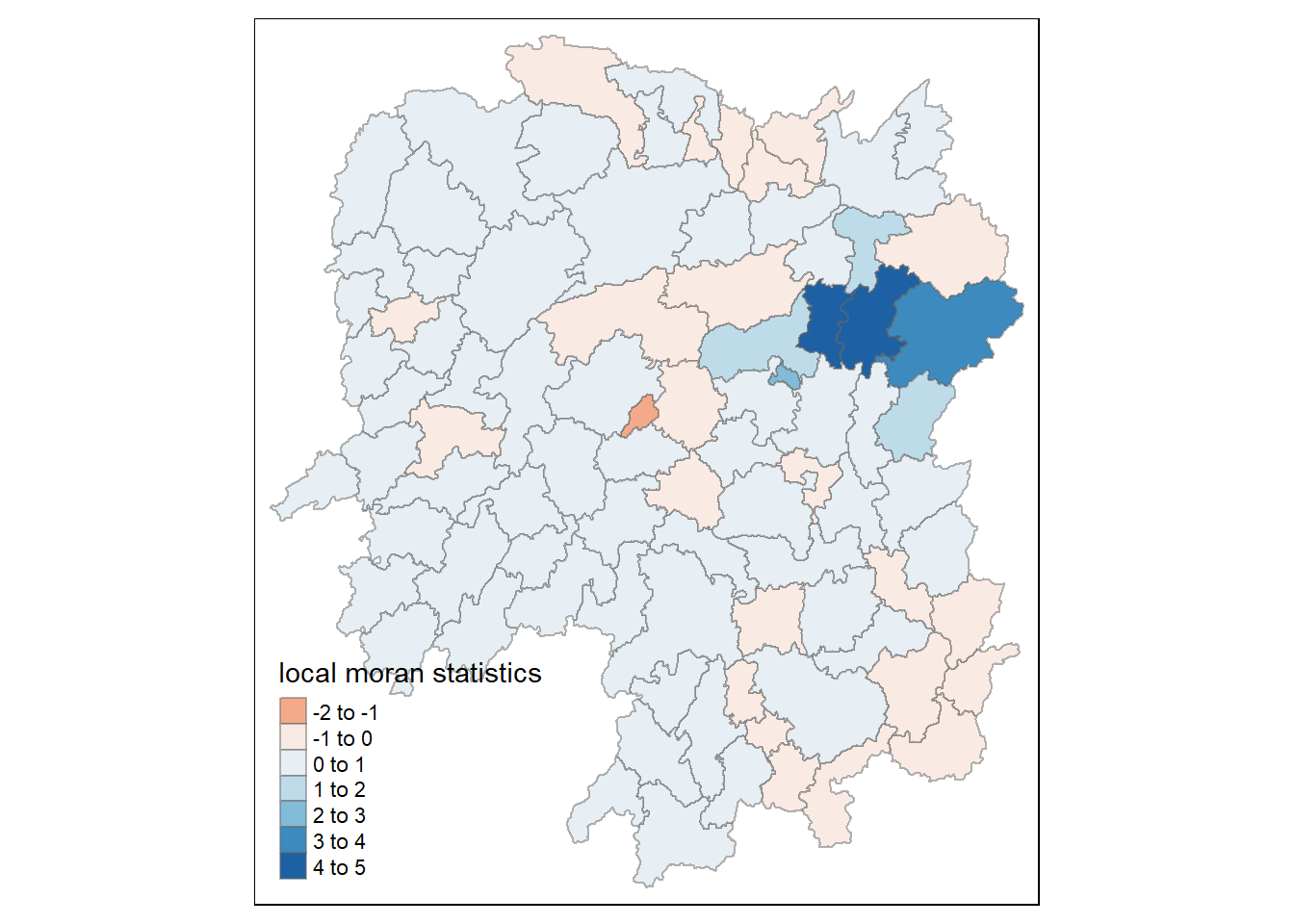 Coldspots (Blue areas): The blue regions represent negative spatial autocorrelation or “coldspots,” where low GDPPC values cluster together. These areas are likely experiencing lower economic activity relative to their neighbors. The most noticeable coldspot is in the southwest.