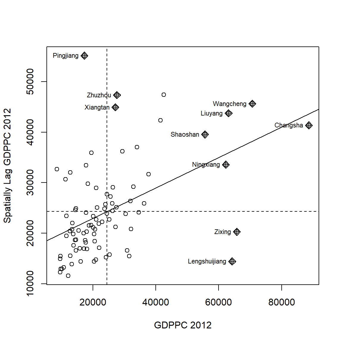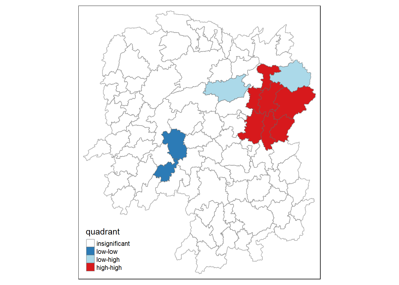 Neutral areas: The lighter shades of blue and red indicate regions with no significant spatial autocorrelation, meaning that the GDPPC in these areas does not display a strong clustering pattern relative to nearby areas.