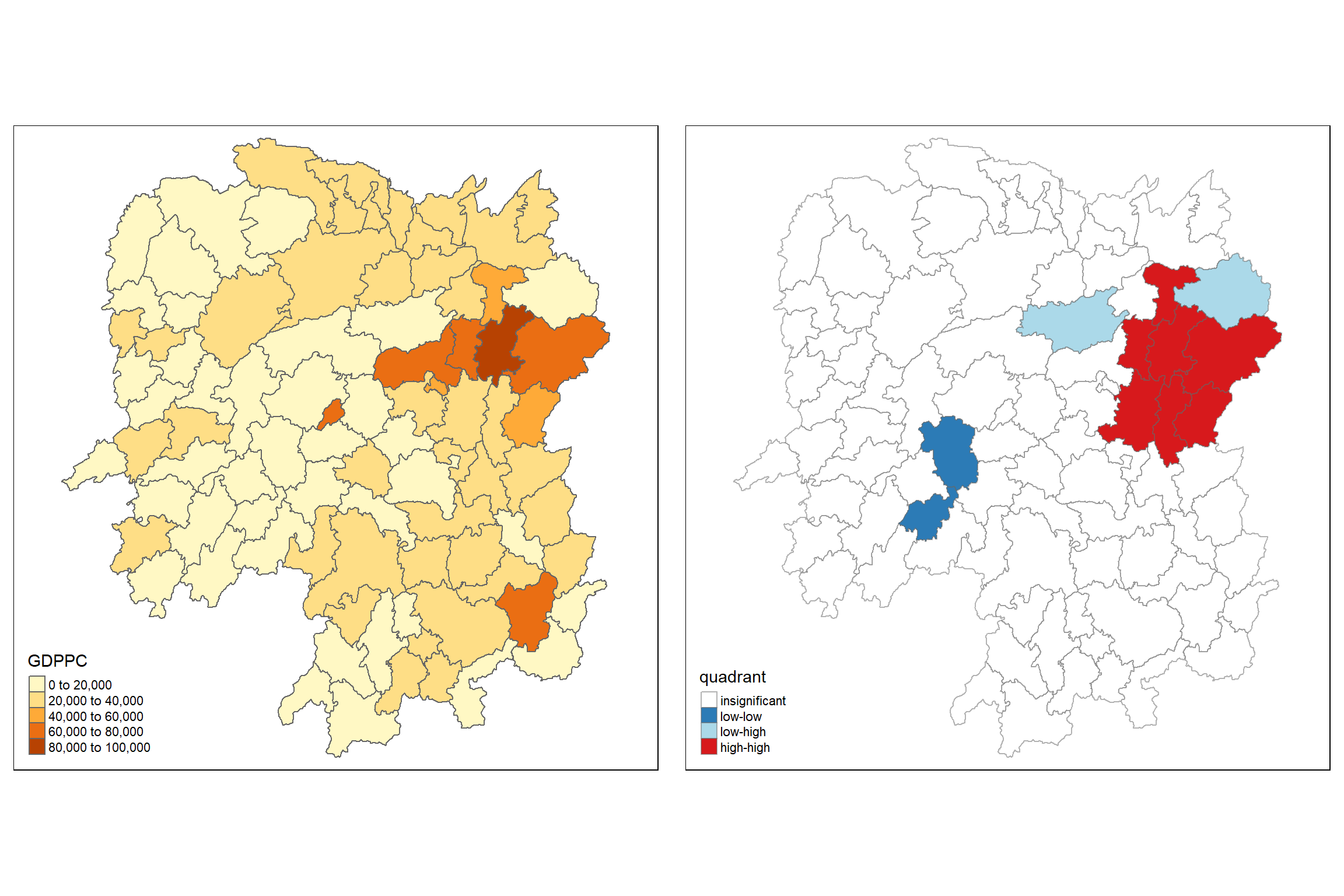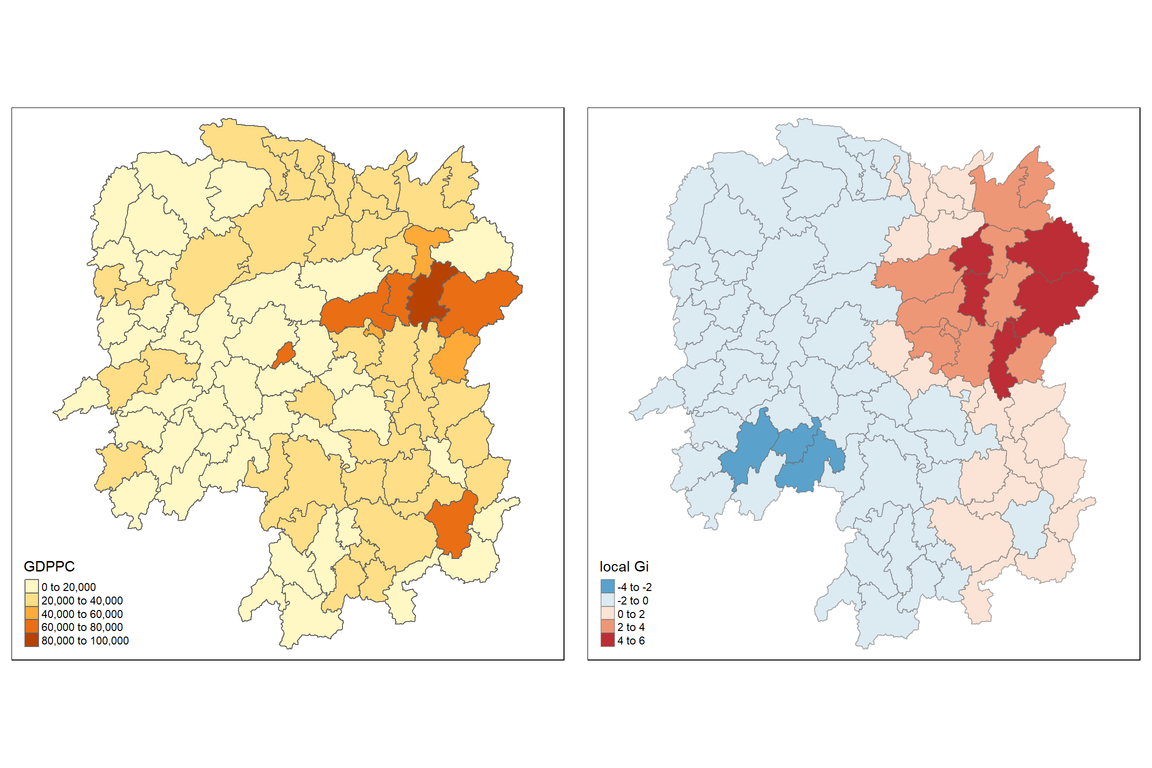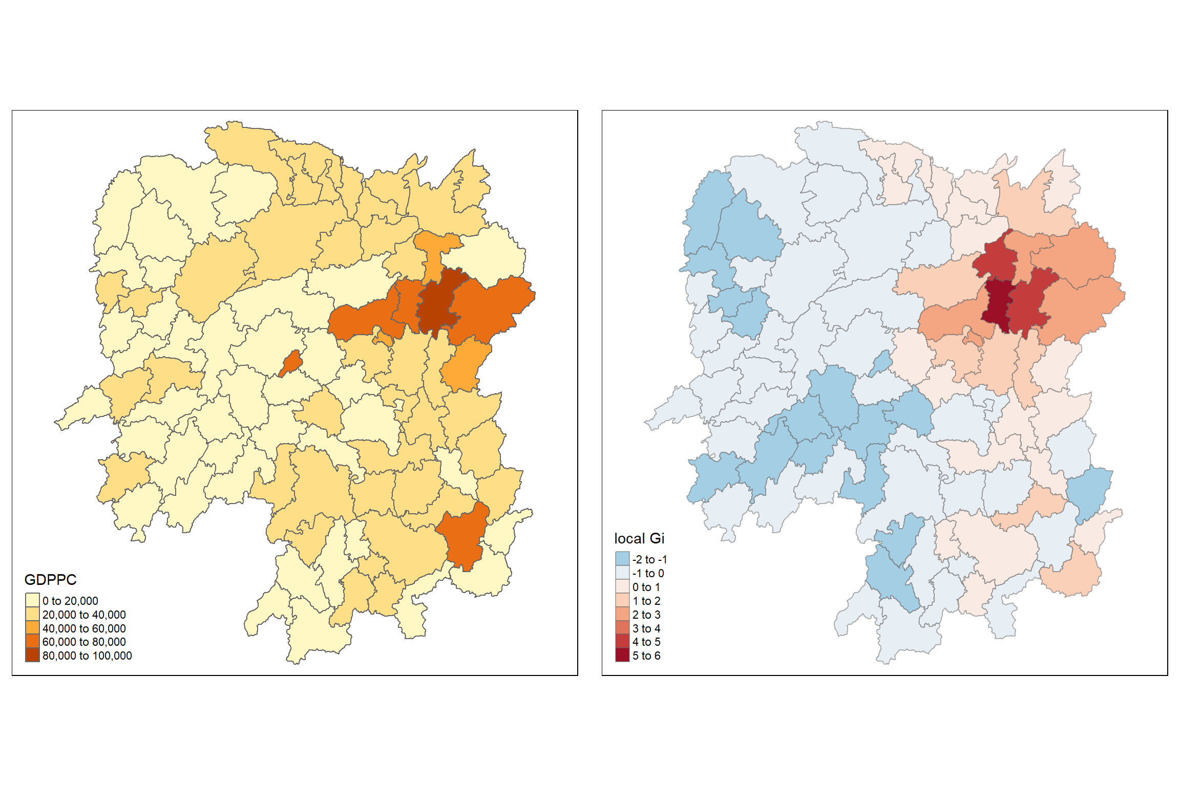 The two maps in the LISA analysis show the distribution of GDPPC and the local Gi statistics for spatial clustering:
