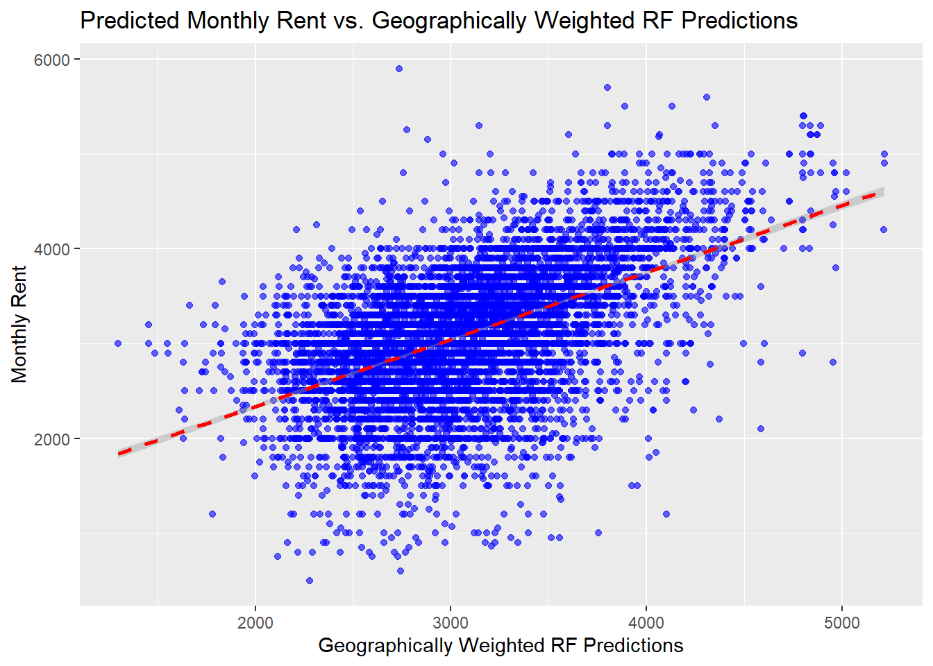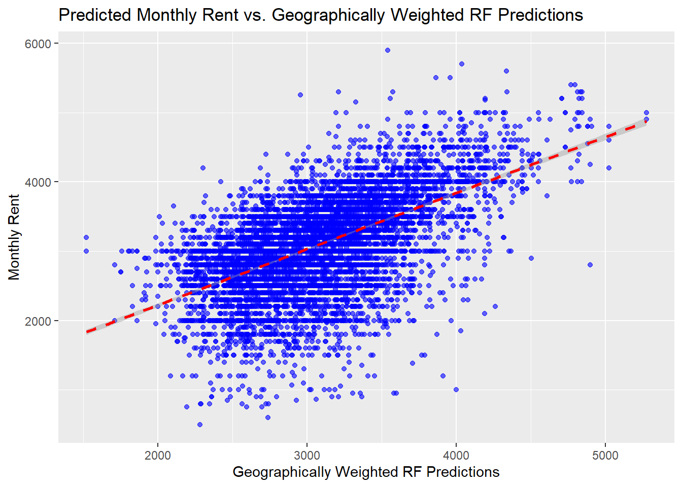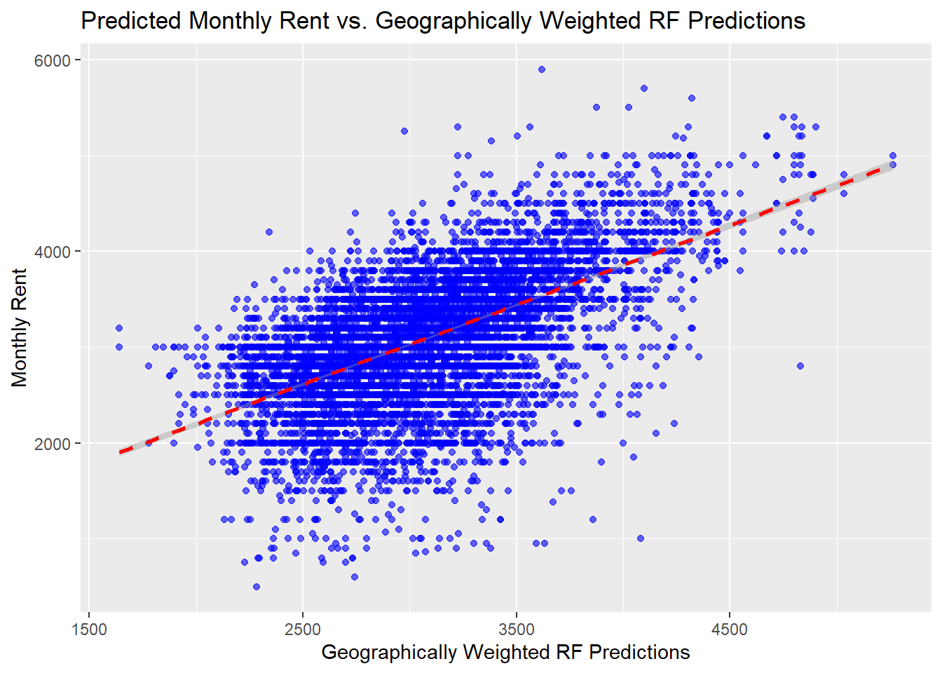 test_data_gp <- test_data_gp[, !duplicated(names(test_data_gp))]ggplot(data = test_data_gp, aes(x = gwRF_pred, y = monthly_rent)) +