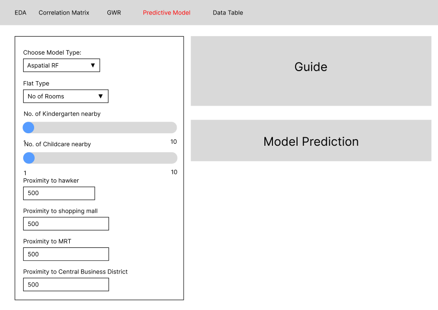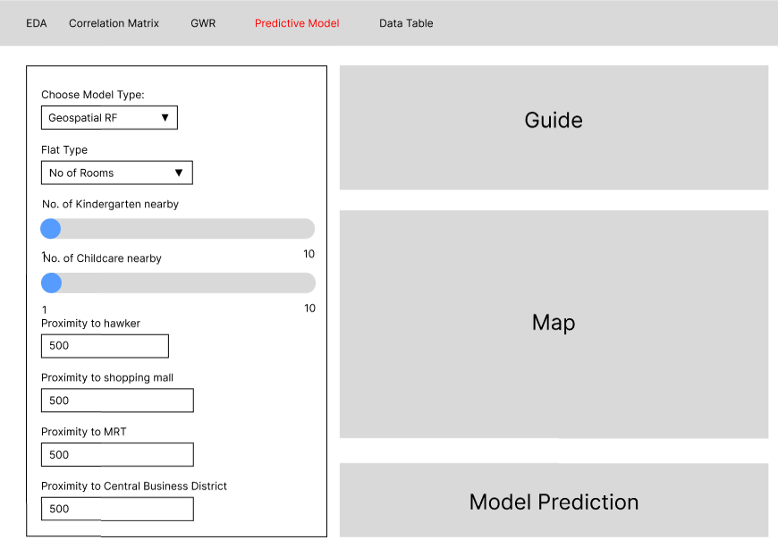 The side panel (and the Map section for Geospatial model types) would simulate the functions of a calculator, where users would be able to input certain aspects of the their ideal HDB rental location to determine a likely monthly rental cost. Together this would provide users with a clearer understanding of how to interact with the tool and a polished output section for viewing predictions